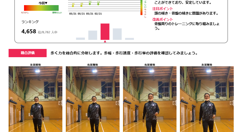 AI分析アプリを活用し、立ち姿、歩きの動作から歪みや傾きを確認しトレーニングの参考に出来ます。